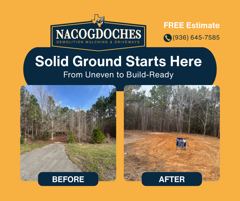NAC DMD proudly serves Nacogdoches and communities throughout East Texas, working with homeowners, landowners, ranches, and commercial clients. If you’re looking for a reliable land clearing and demolition contractor who shows up, communicates clearly, and delivers quality work, we’re ready to help.